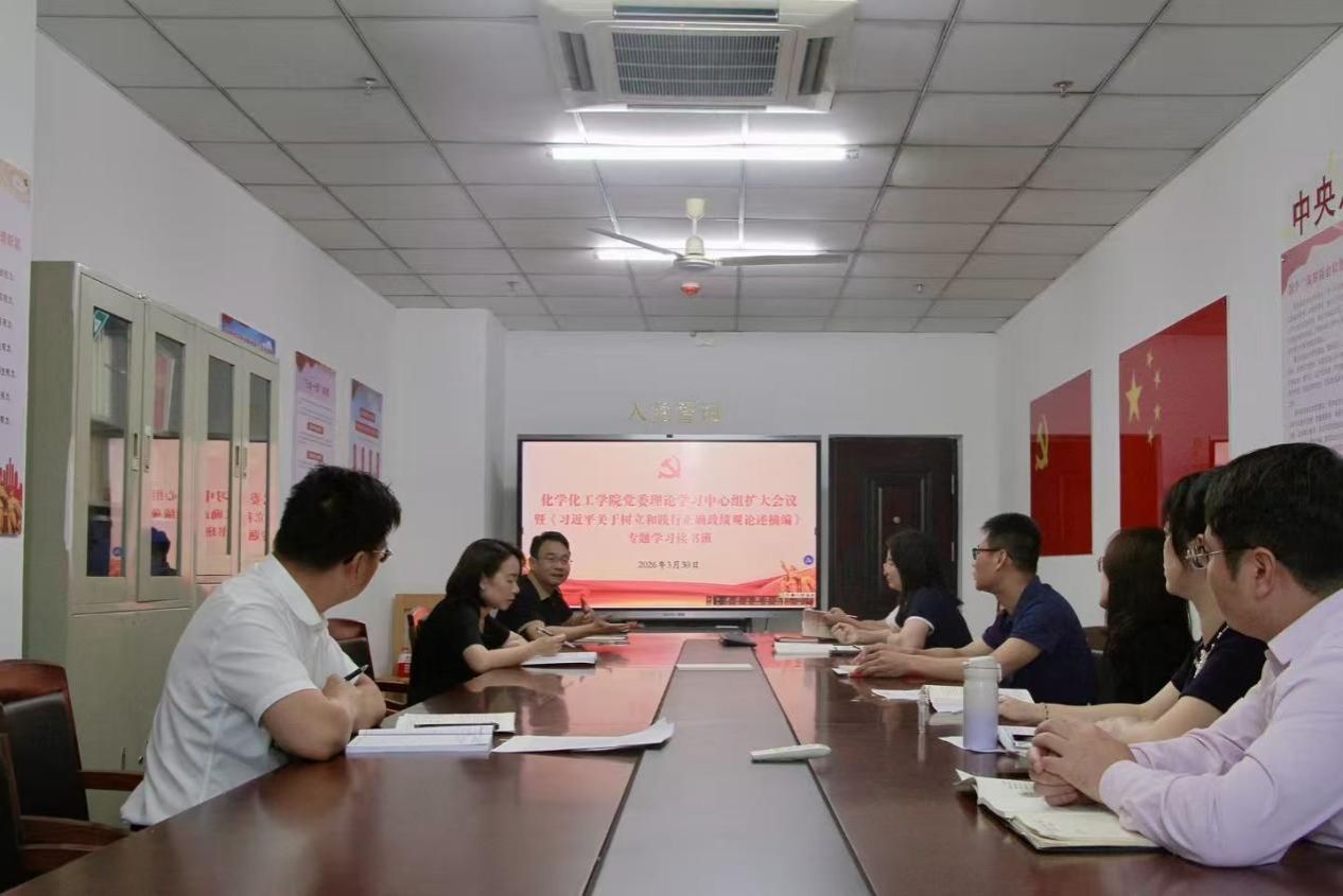 2026年3月30日至31日,化学化工学院召开党委理论学习中心组扩大会议暨《习近平关于树立和践行正确政绩观论述摘编》专题学习读书班。院党委副书记(主持工作)杨玮婷,副院长李嘉诚、王小红、李满荣等党委委员及各党支部书记参加会议。会议由党委副书记熊文军主持。