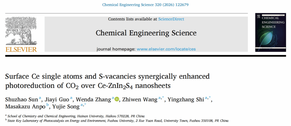 论文信息:Surface Ce single atoms and S-vacancies synergically enhanced photoreduction of CO2over Ce-ZnIn2S4 nanosheets, Chemical Engineering Science 320 (2026) 122679.