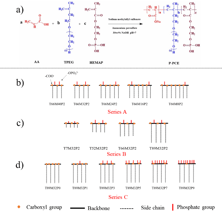 鉴于此,海南大学化学化工学院潘莉莎教授团队提出 “络合吸附-马兰戈尼效应” 策略,引入2-羟乙基甲基丙烯酸酯磷酸酯(HEMAP)作为功能消泡单体,经过水溶液自由基聚合成功合成低引气型聚羧酸减水剂(P-PCE),并通过调节聚醚大单体的聚合度以及甲基丙烯磺酸钠(MAS)和HEMAP的摩尔比对P-PCE的主链长度、侧链长度和磷酸根密度进行调控,其反应方程式和结构示意图如图3所示。