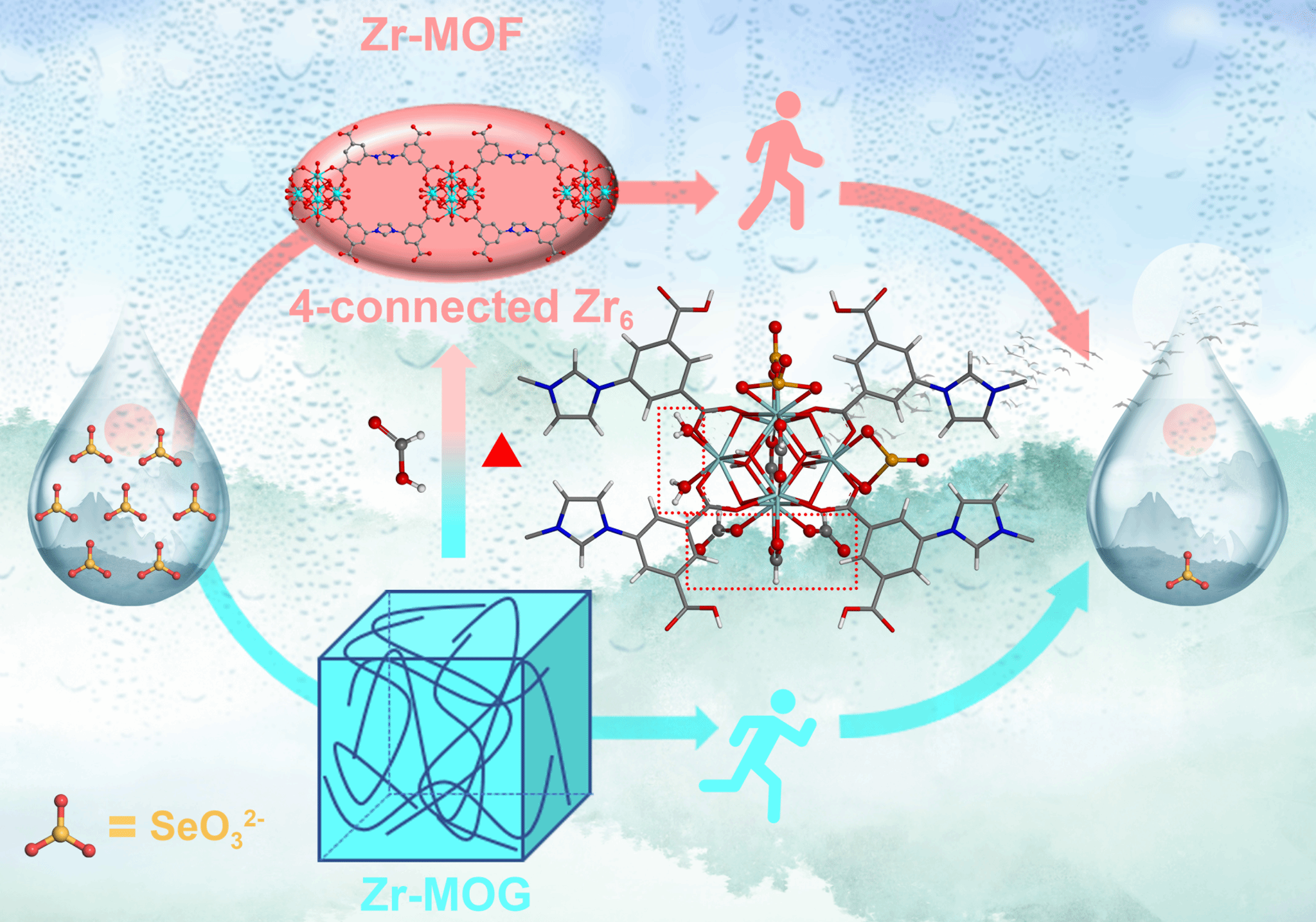 近日,海南大学化学化工学院先进功能多孔材料团队在水环境Se(IV)污染物高效去除领域取得新进展。团队基于Zr6簇的不饱和开放位点,成功设计并合成了对Se(IV)具有高吸附量的4-连接Zr-MOF(HNU-88)。其中间体的金属有机凝胶材料(HNU-G8),实现了对水环境水体中Se(IV)的快速吸附去除。相关研究成果以“Unlocking open metal sites in Zr-MOF/MOG for efficient and rapid Se(IV) adsorption”为题发表于期刊《Science China Chemistry》(中国科学院一区Top,IF=9.7),论文链接:http://engine.scichina.com/doi/10.1007/s11426-026-3401-3。博士研究生周琪为论文第一作者,任国建副教授和潘勤鹤教授为论文共同通讯作者。